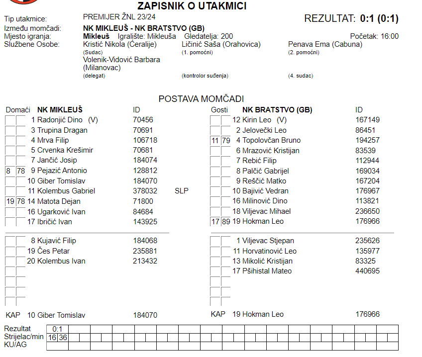 Bratstvo i dalje nastavlja pružati dobre partije i upisivati vrijedne bodove. U Mikleušu protiv istoimenog domaćina nisu imali ni malo lak zadatak što svjedoči rezultat. Međutim u prvom dijelu čovjek odluke bio je Milinović koji je postigao pogodak za 1:0 što se ispostavilo kao konačan rezultat.