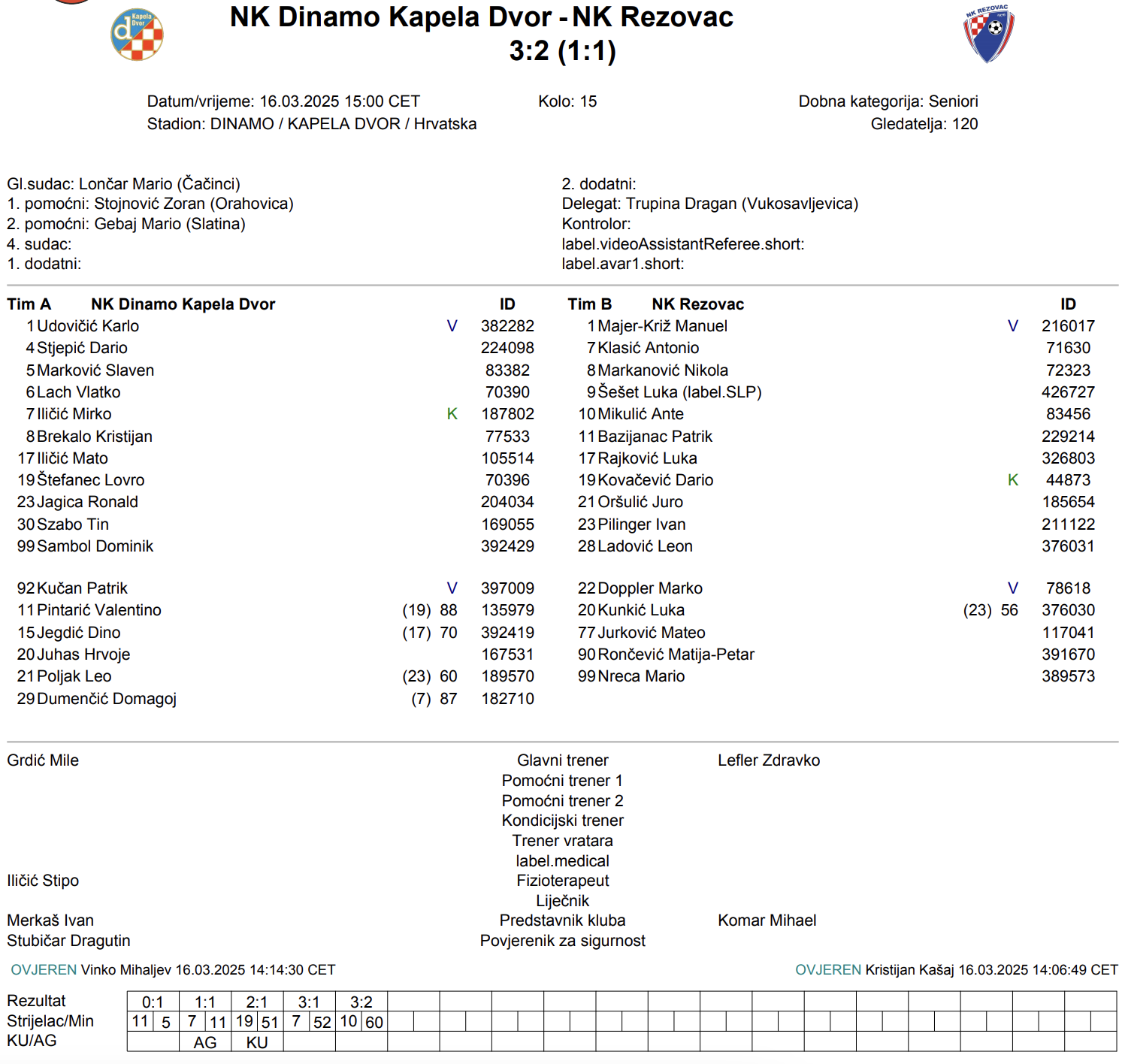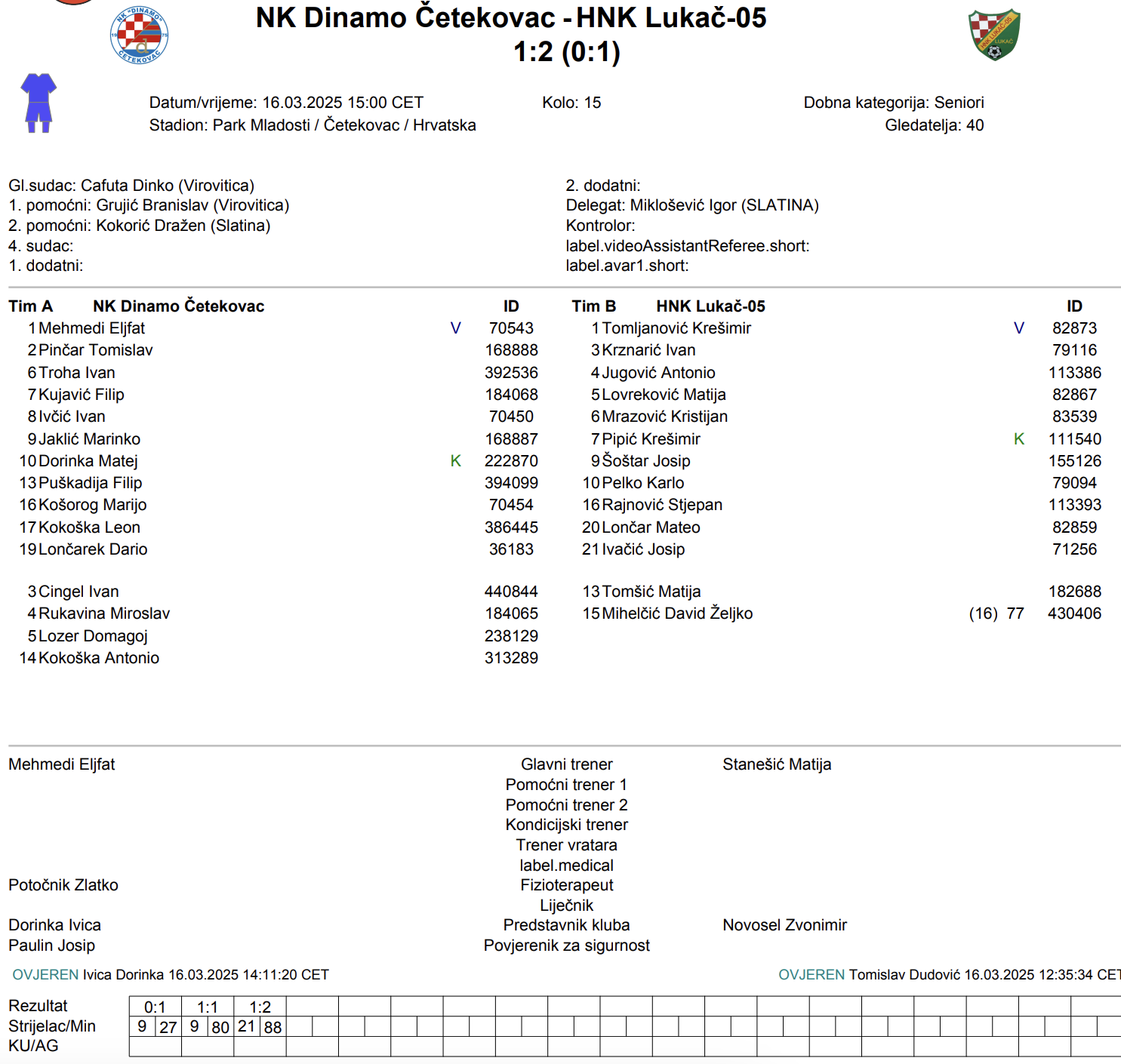 – Teška utakmica zbog potpuno natopljenog terena, što nam nije omogućilo da razvijemo našu igru. Ipak, dominirali smo i stvarali šanse, poveli sredinom prvog poluvremena te kontrolirali susret do 80. minute, kada domaćin odličnom kontrom dolazi do izjednačenja. Nakon toga smo sve bacili u napad i pred kraj utakmice postigli pobjednički pogodak. S obzirom na teške uvjete, čvrstog i motiviranog protivnika, smatram da je pobjeda ipak zaslužena. – za Sportalo rekao je trener Lukača, Zvonimir Novosel.