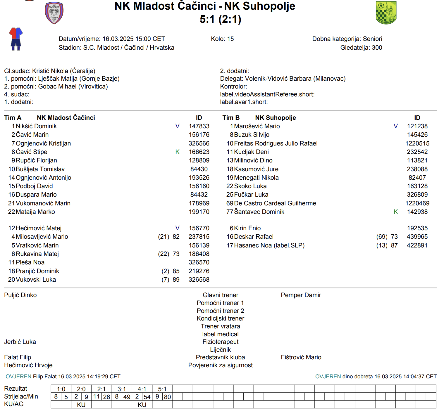 Mladost Čačinci pružila je fantastičnu partiju i uvjerljivo pobijedila Suhopolje s 5:1. Briljirao je dvojac Stipe Čavić i Marin Čavić, koji su zajedno postigli četiri pogotka – Stipe u 5. i 49. minuti, a Marin u 9. i 54. minuti oba iz kaznenih udaraca. U 19. minuti obje ekipe ostale su bez jednog igrača – domaćini bez Antonija Ognjenovića, a gosti bez Luke Skoke, nakon scenarija koji ne želimo vidjeti na nogometnim terenima… Gosti su nakratko smanjili preko Denija Kucljaka u 26. minuti, no to je bilo sve od Suhopolja. Točku na “i” stavio je Florijan Rupčić u 80. minuti. Mladost je ovom pobjedom pokazala zašto je prva i uzvratila je za onaj poraz iz 2. kola.