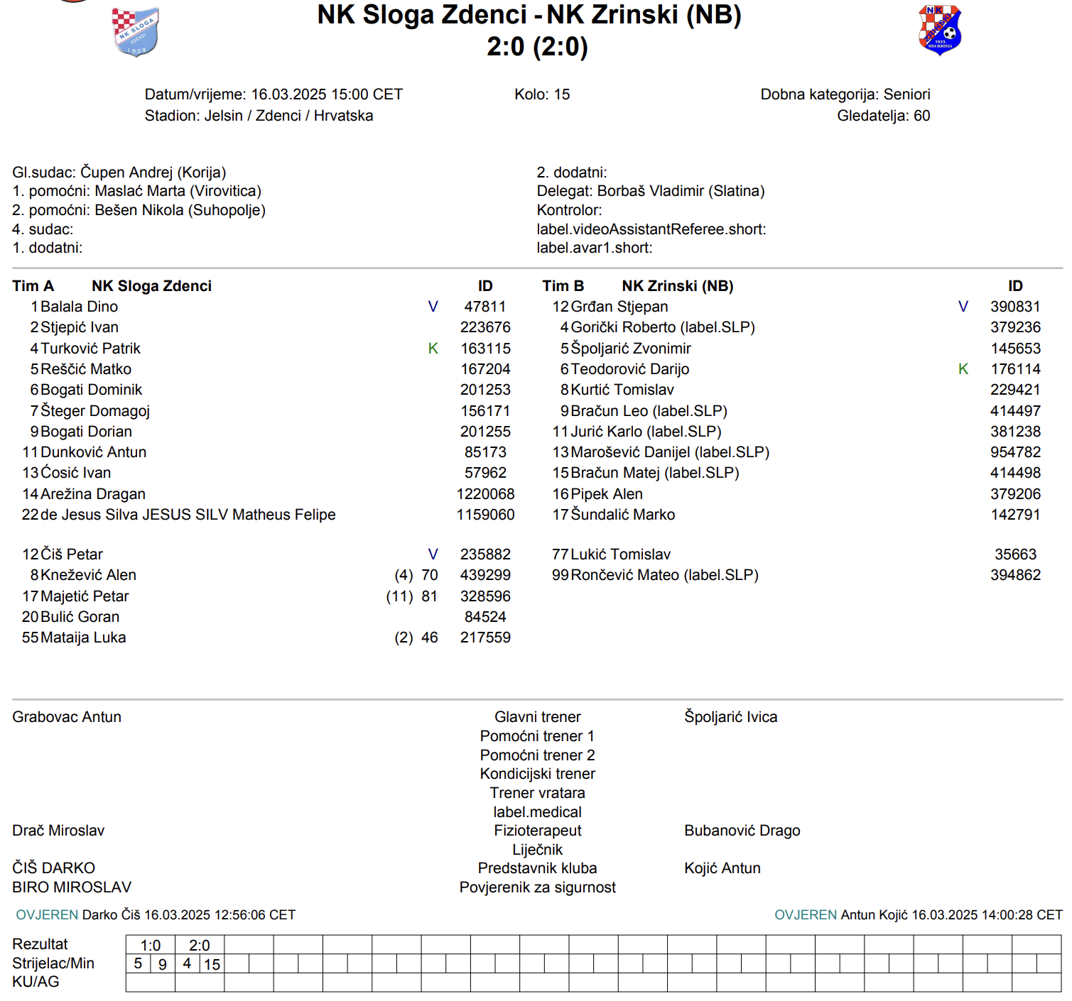 Sloga Zdenci rutinski je svladala Zrinski rezultatom 2:0, a ključni trenuci dogodili su se u ranoj fazi susreta. Matko Reščić je već u 9. minuti doveo domaće u vodstvo, dok je Patrik Turković u 15. minuti postavio konačnih 2:0. Sloga je nakon tog pogotka mirno kontrolirala utakmicu i nije dopustila gostima da se vrate u susret. Zrinski je pokušao, ali nije pronašao put do mreže, te su Zdenci zasluženo slavili.