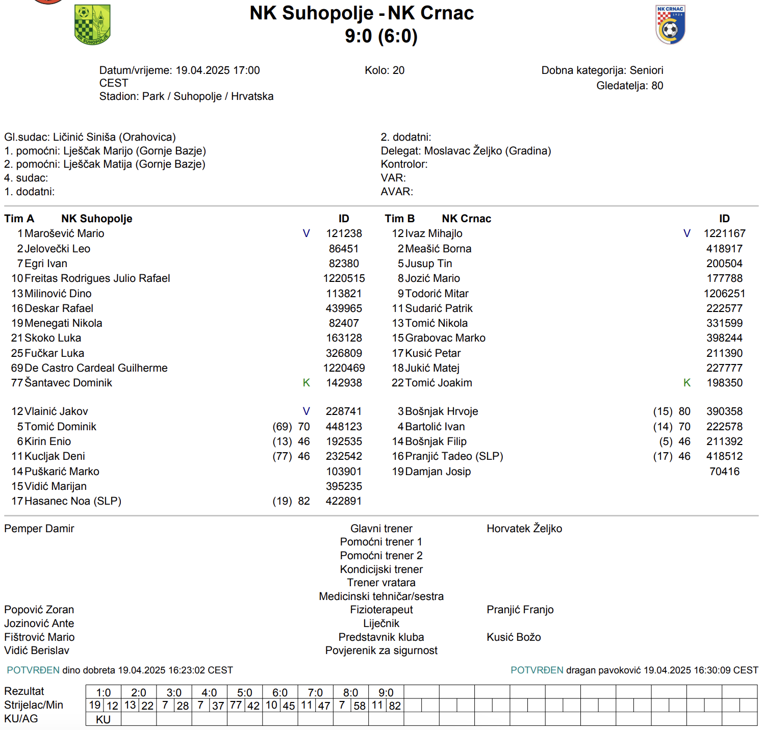 – Sretan Uskrs! Utakmica od samog početka je išla u jednom smjeru. Rano smo poveli, u 12-oj minuti, poluvrijeme je završilo rezultatom 6:0 i još smo imali 3 do 4 dobre prilike, ali je vratar NK Crnca odlično reagirao. U drugom poluvremenu se nastavlja naša dominacija uz brojne prilike poentirali smo još 3 puta i završili utakmicu rezultatom 9:0. Čestitke mojim igračima na dobroj i efikasnoj utakmici, a suparniku na fer korektnoj utakmici. – izjavio je Damir Pemper, trener Suhopolja.