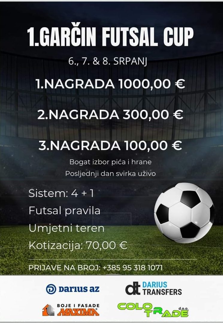 Premda u središtu Općine Garčin u samom mjestu uznazad nekoliko sezoona nemaju seniorsku ekipu NK Gardun, tu je Škola nogometa Sportiva s neumornim Kristijanom Šimićem. Tako su on i Dario Filipović koji je tajnik u MNK Brod 035 odlučili pokrenuti 1. „Garčin futsal cup“ koji će krenuti u četvrtak 6. srpnja. Turnir će se igrati kroz 3 dana, dok je subotu 8. srpnja s početkom od 20 posljednji dan i završnica. Tako je nakon dobro poznatog zimskog turnira u Garčinu, na red došao i prvi ljetni futsal turnir. Velika motivacija za njegovom organizacijom je otvaranje novog terena s umjetnom travom tako da ekipe koje će sudjelovati na turniru zaigrat će na novoj netaknutoj travi uz sistem igre 4+1 i futsal pravila. S obzirom na solidne nagrade za najbolje, očekuje se odličan odaziv ekipa s područja Brodsko – posavske županije, pa i šire.