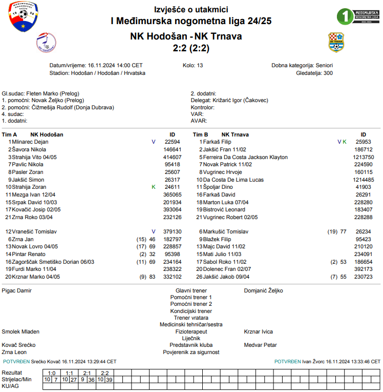 Hodošan i Trnava imali su jednak učinak prije njihovo susreta. Obje momčadi imale su identičan omjer pobjeda, poraza i remija, a zapanjujuće jest da im je i gol razlika bila ista. Da stvar bude još bolja, tako će ostati i preko zime jer su u vikendu iza nas odigrali neriješeno 2:2. U zanimljivoj utakmici sve smo pogotke vidjeli u prvom djelu jer su Zoran Strahija i Simon Jakšić pogađali za Hodošan u 7. i 36. minuti, a Lucas Da Costa je dva puta morao smanjivati prednost domaćih pa je tresao mrežu u 27. i 39. minuti za 2:2. Tako je i ostalo do kraja pa su se obje momčadi morale zadovoljiti bodom iz ovog susreta.