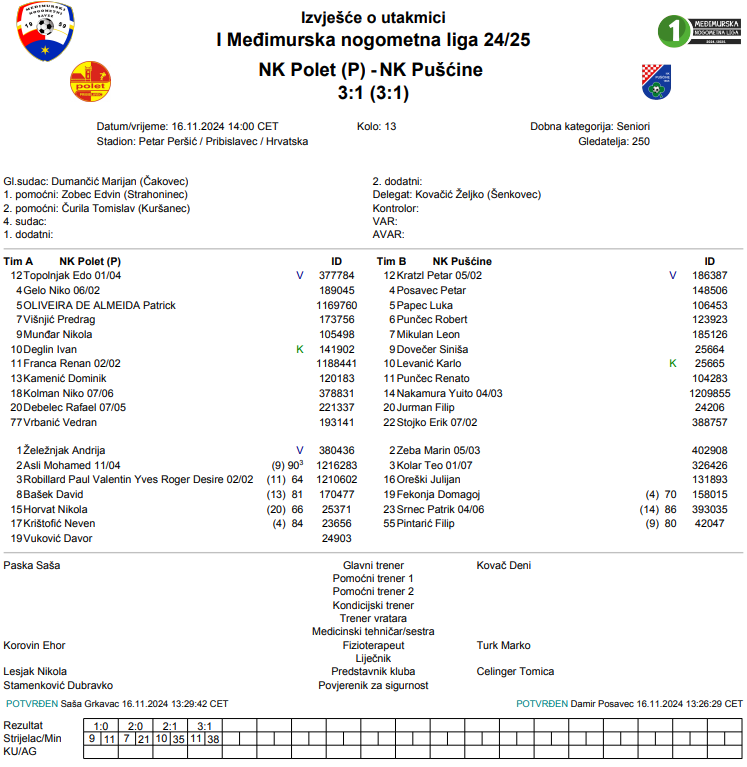 Derbi posljednjeg kola odigran je u Pribislavcu, a slobodno se može priznati da je ispunio sva očekivanja. Pred 250 gledatelja, obje momčadi pružile su dobru nogometnu partiju i ova će se utakmica sigurno naći na popisu najboljih ovogodišnjih partija Poleta. Da obje momčadi žele pobjedu pokazale su u prvom djelu jer su postignuta četiri pogotka! Prvo je najbolji strijelac lige Nikola Munđar nakon solo prodora s ivice šesnaesterca pogodio za prednost Poleta 1:0. Samo desetak minuta kasnije Predrag Višnjić je pospremio loptu glavom nakon prekida i tako povećao prednost Poleta na dva gola razlike. Kapetan gostiju Karlo Levanić u 35. minuti je iskoristio kiks domaće obrane i sjajnim lobom matirao vratara Edu Topolnjaka. Nije ta radost Pušćina dugo potrajala jer je Renan Franca samo dvije minute kasnije vratio prednost Poleta na dva gola razlike, a ispostavit će se kasnije i postavio konačan rezultat. Poseban je ovo vikend bio za Predraga Višnjića. On je prije samo par dana proslavio 24. rođendan, postigao gol i asistirao u podvigu osvajanja titule jesenskog prvaka, a od vikenda zvanično nosi titulu zaručnika jer je nakon utakmice na vrlo romantičan način zaručio svoju djevojku pred suigračima i simpatizerima kluba.