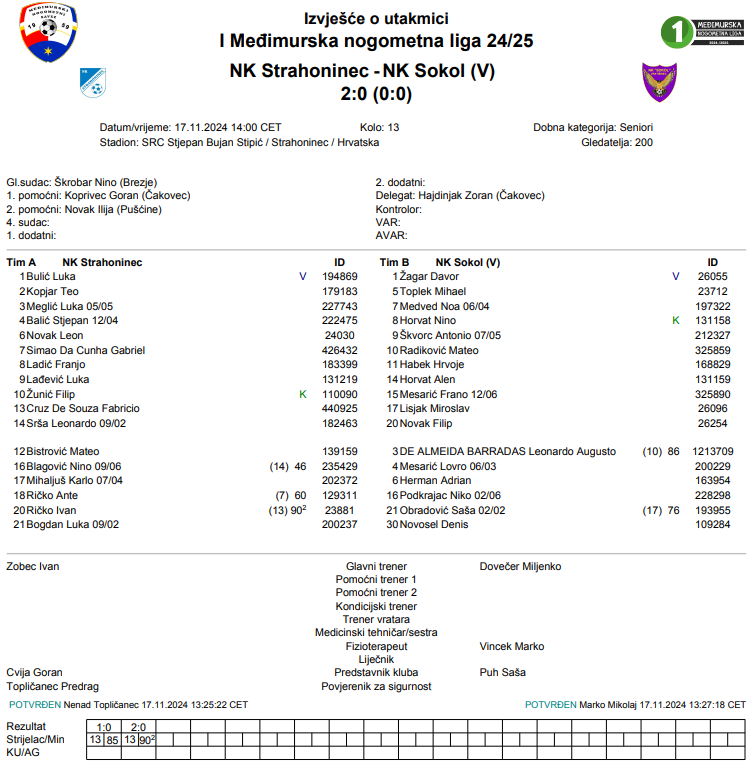 Strahoninec je u napetoj utakmici protiv Sokola uspio iščupati bodove na samom kraju. Iako su gosti držali posjed, nisu uspjeli iskoristiti svoje šanse. S druge strane, Brazilac Fabricio je svoje prigode dočekao u 85. i 92. minuti pa je Strahonincu donio velika tri boda. Strahoninec je nakon trinaest utakmica ostvario pet pobjeda i pet remija što je dovoljno za poziciju broj 6. Njihov rival od vikenda Sokol ima jednu manje pobjedu i dva manje remija pa se nalazi na 11. mjestu uz 14 osvojenih bodova na kraju jesenskog dijela natjecanja.
