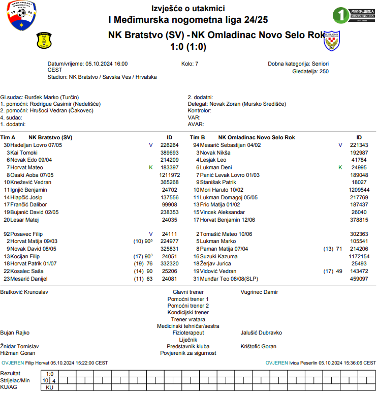 Bratstvo se vratilo na pobjednički kolosijek jer su na svom terenu pobijedili Omladinac. Minimalan rezultat bio je dovoljan, a za njega je zaslužan Vedran Knežević. On je vrlo rano doveo Bratstvo u vodstvo pogotkom iz jedanaesterca u 4. minuti utakmice. Aoba Osaki je u 36. minuti dobio drugi žuti, isključujući karton pa se Bratstvo moralo prilagoditi na igrača manje u nastavku. Iako su više od 50 minuta gosti imali brojčanu prednost, nisu uspjeli poravnati rezultat pa se sa gostovanja iz Savske Vesi vraćaju bez ijednog boda.