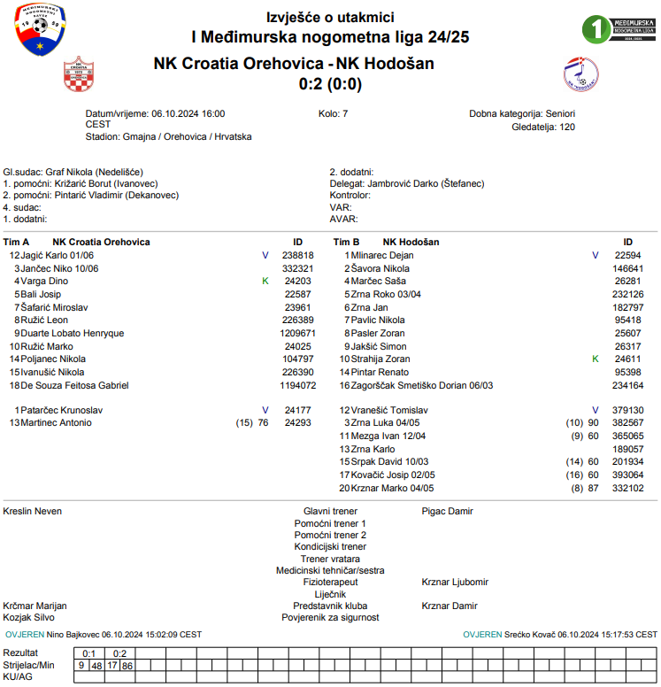 Hodošan je još jedna momčad koja se s gostovanja vraća s cijelim plijenom. Oni su u okviru sedmog kola gostovali Croatiji u Orehovici i pobijedili. Oba pogotka postigli su u drugom poluvremenu, na početku i na kraju istog. Prvi je zabio Simon Jakšić, a za drugi je zaslužan Josip Kovačić. Croatia je nakon ovog poraza vezala četvrtu izgubljenu utakmicu i nalazi se na začelju tablice.