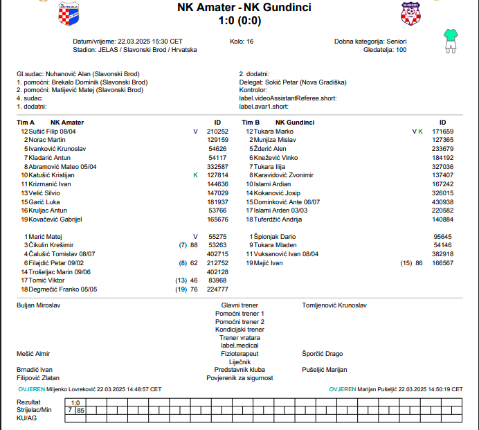 U Slavonskom Brodu, domaći Amater ugostio je momčad Gundinčana u tvrdoj i izuzetno borbenoj utakmici. Tijekom susreta domaćini su pokazali nešto veću inicijativu i stvorili nekoliko izglednijih prilika u odnosu na goste, no rezultat je ostao nepromijenjen sve do završnih minuta. Ključni trenutak dogodio se u 85. minuti, kada je Antun Kladarić zatresao mrežu i donio veliko slavlje domaćoj ekipi.