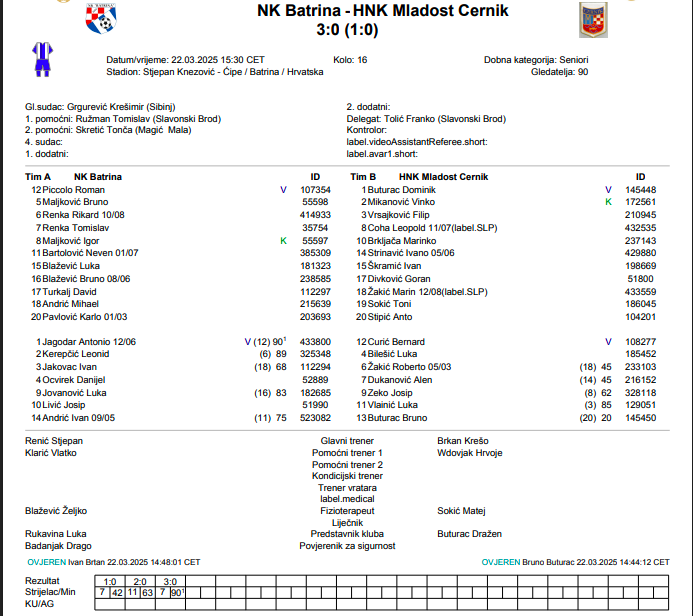 “U utakmicu ulazimo oprezno jer nema mjesta za pogrešku. Borba se vodi na sredini terena, jedna šansa s naše strane i prečka gostiju prethode pogotku u 42. minuti. Nakon odličnog centaršuta, Tomislav Renka zabija za 1:0. U drugom poluvremenu gosti igraju otvoreno, a mi iskorištavamo dvije od tri-četiri šanse i na kraju pobjeđujemo 3:0. Napokon smo odigrali kako treba. Tomislav Renka, po ‘tko zna koji put’, dokazuje svoju klasu i ovu utakmicu završava s dva pogotka. Gostima sretno dalje, a nas čeka borba – idemo utakmicu po utakmicu kako bismo osigurali status!” – izjavio je Danijel Ocvirek, tajnik i kapetan Batrine.