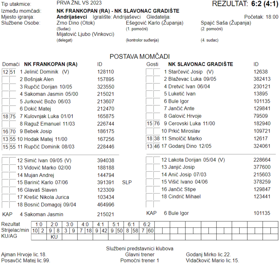 | 21.05.2023 18:00 | Andrijaševci | NK Frankopan (RA) – NK Slavonac Gradište | 6:2 | ||