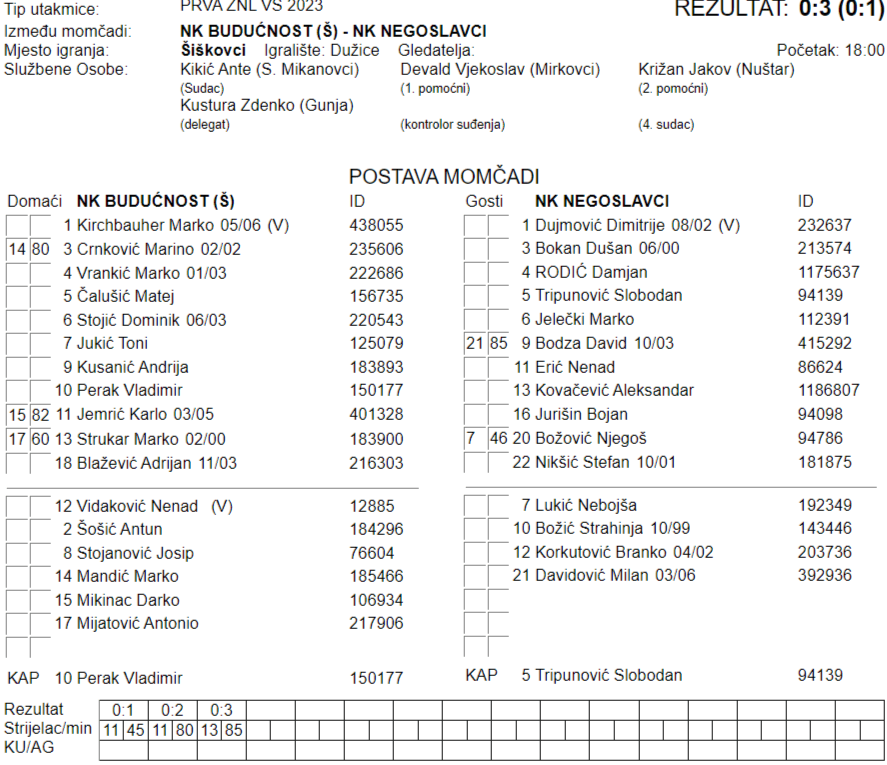 | 21.05.2023 18:00 | Šiškovci | NK Budućnost (Š) – NK Negoslavci | 0:3 | ||