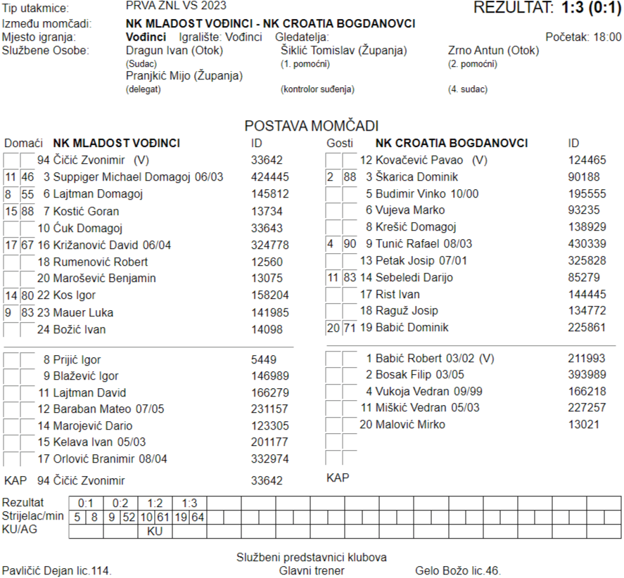 | 21.05.2023 18:00 | Vođinci | NK Mladost Vođinci – NK Croatia Bogdanovci | 1:3 | ||