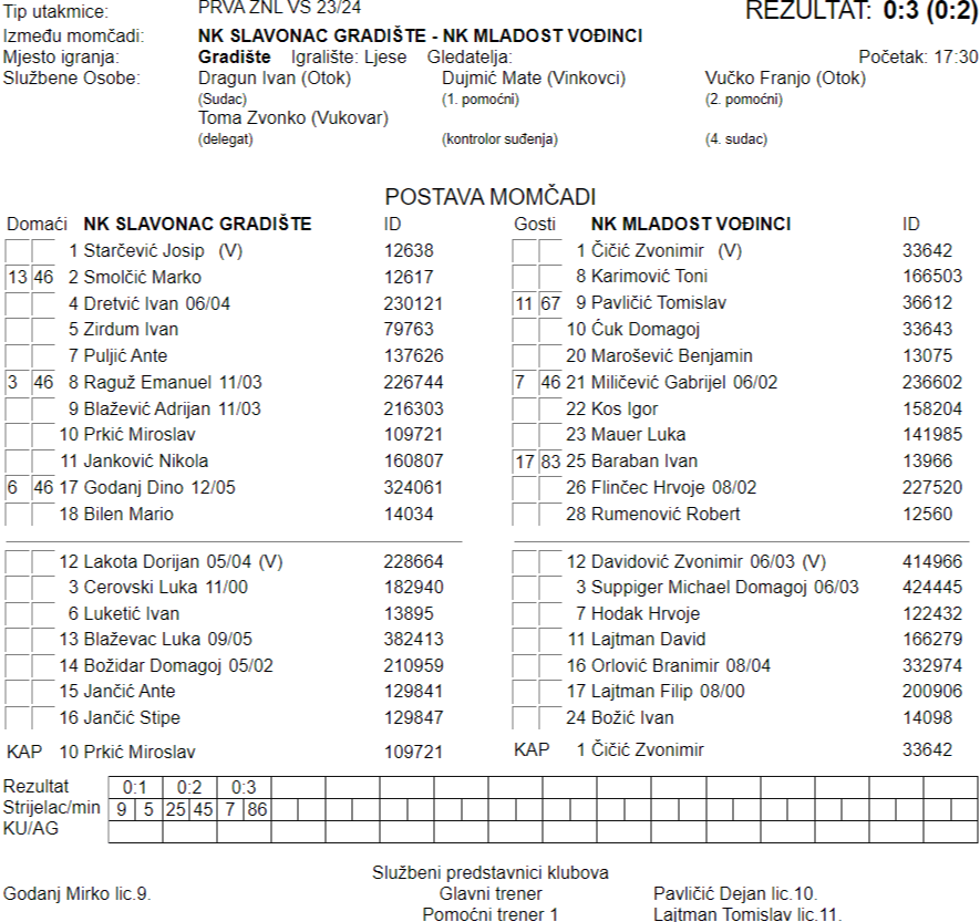 1 13.08.2023 17:30 Gradište NK Slavonac Gradište – NK Mladost Vođinci 0:3