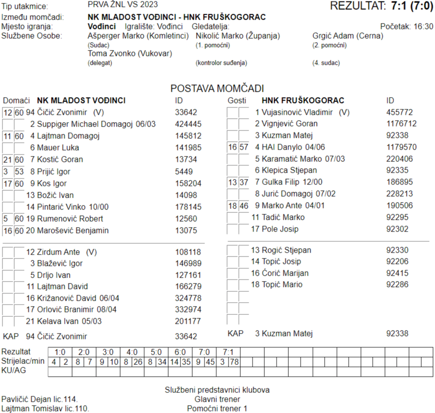 | 19 | 02.04.2023 16:30 | Vođinci | NK Mladost Vođinci – HNK Fruškogorac | 7:1 | |