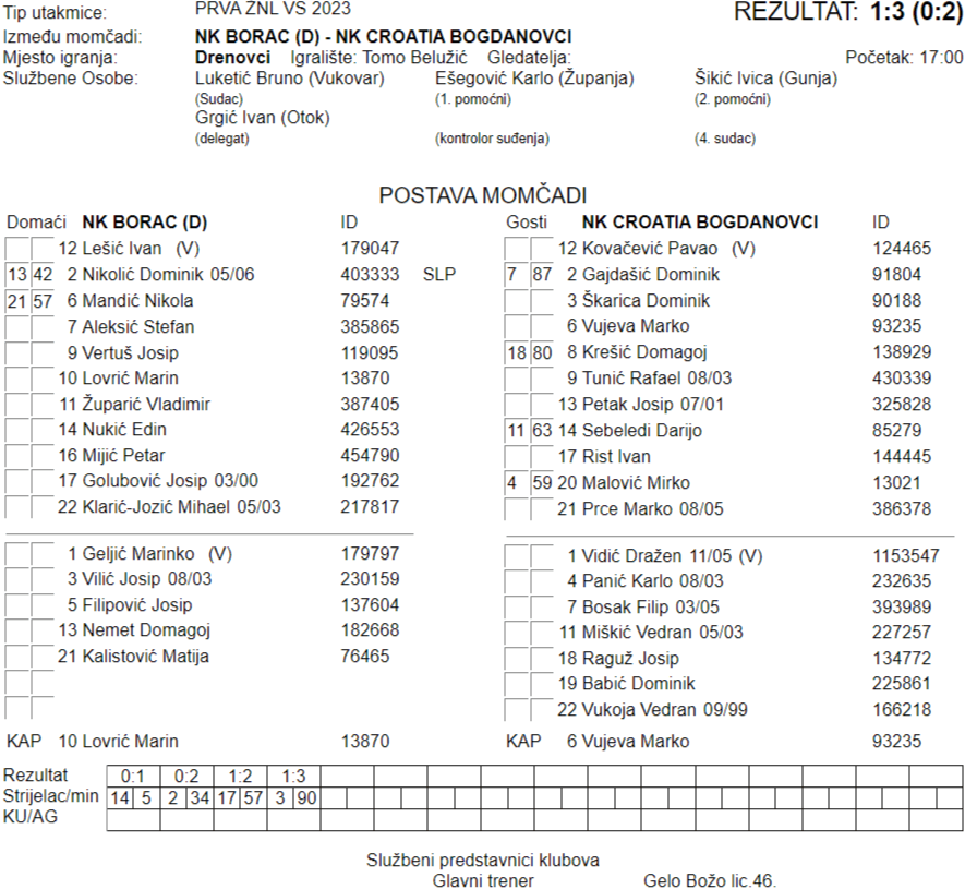 | 22 | 19.04.2023 17:00 | Drenovci | NK Borac (D) – NK Croatia Bogdanovci | 1:3 | |