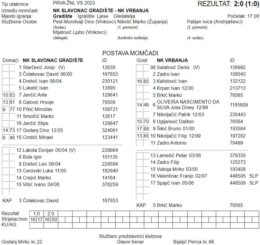 | 19.04.2023 17:00 | Gradište | NK Slavonac Gradište – NK Vrbanja | 2:0 | ||