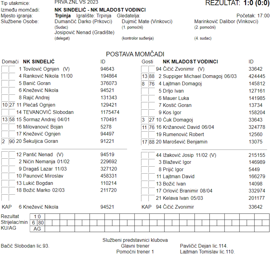 | 22 | 19.04.2023 17:00 | Trpinja | NK Sinđelić – NK Mladost Vođinci | 1:0 | |