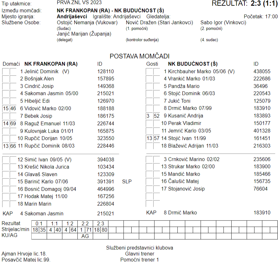 | 19.04.2023 17:00 | Andrijaševci | NK Frankopan (RA) – NK Budućnost (Š) | 2:3 | ||