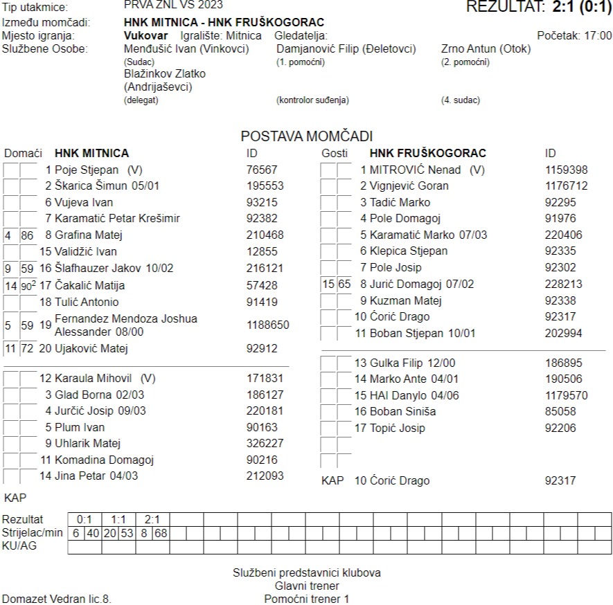 | 22 | 19.04.2023 17:00 | Vukovar | HNK Mitnica – HNK Fruškogorac | 2:1 |