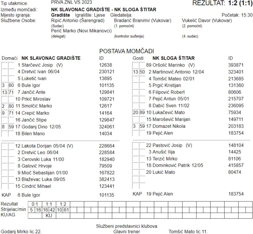 | 12.03.2023 15:30 | Gradište | NK Slavonac Gradište – NK Sloga Štitar | 1:2 | ||