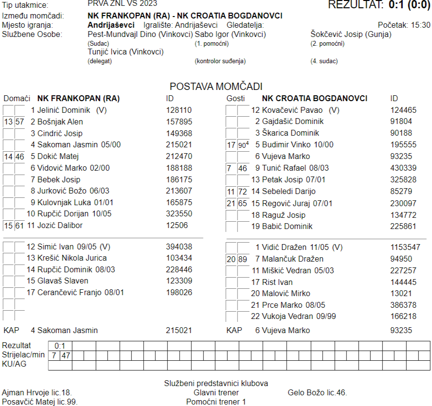 | 12.03.2023 15:30 | Andrijaševci | NK Frankopan (RA) – NK Croatia Bogdanovci | 0:1 | ||