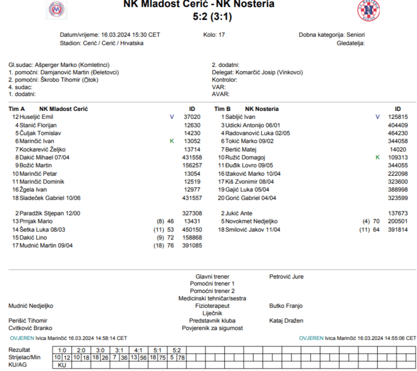 | 17 | 16.03.2024 15:30 | Cerić | NK Mladost Cerić – NK Nosteria | 5:2 | |