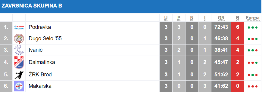 Podravka je dominirala u skupini B. Dva nastupa, dvije pobjede. Najprije su vodile veliku borbu s Dugim Selom 55, i prelomile susret tek u posljednjih pet minuta. Poslijepodne su pak s 14 razlike svladale Makarsku i suvereno drže prvo mjesto. Tena Megerle koja inače u posljednje vrijeme dobiva priliku u seniorskoj konkurenciji povukla je najviše protiv Dugog Sela 55 sa sedam pogodaka. U drugom je čak 12 rukometašica Podravke bilo na listi strijelaca.