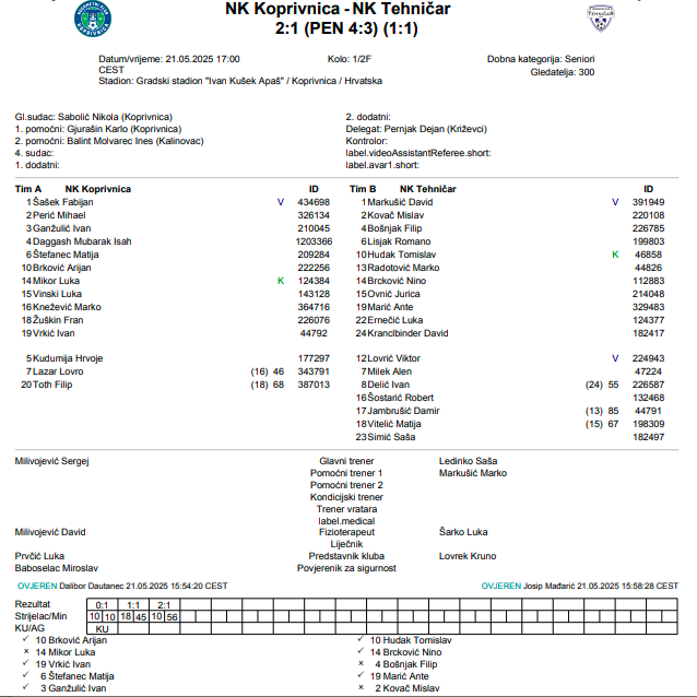 Jučer su odigrani polufinalni susreti Koprivničko-Križevačkog kupa. Koprivnica je na domaćem terenu ugostila Tehničar iz Cvetkovca, a o pobjedniku su odlučivali kazneni udarci, u kojima su domaći igrači pokazali veću preciznost i osigurali plasman u finale. Drugi finalist je Radnik iz Križevaca, koji je pred svojom publikom ugostio Graničar iz Đurđevca. Iako je utakmica završila bez pogodaka, Radnik je, zahvaljujući pobjedi iz prvog susreta u Đurđevcu, potvrdio svoje mjesto u završnici natjecanja.
