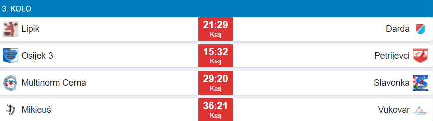 | 8. | Lipik | 3 | 0 | 0 | 3 | 53:71 | 0 | ||