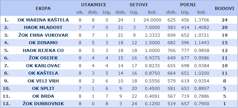 Odbojkašice ŽOK Osijeka nisu se dobro provele ovaj vikend na parketu jer su na gostujućem terenu u Zagrebu poražene od Dinama 3:1 (21:25, 25:15, 25:17, 25:18) drugi put u tjedan dana, a nakon poraza u Kupu Snježane Ušić na domaćem terenu. Dobro je susret započeo za Osijek, vrlo agresivno su krenule izabranice Tome Pauna u ovaj susret te im je sve polazilo od ruke pa je vrlo brzo osvojen prvi set. Osvajanje tog seta kao da je ispuhalo gošće pa su nakon toga na terenu postojale samo domaće igračice koje nisu dopustile mladim Osječankama nijedan set do kraja utakmice te su sigurnom odbojkom uzele novu pobjedu. Ostaje žal za bodovima kod Osijeka jer su gošće pokazale kako mogu odigrati jako lijepu odbojku, no vjerojatni manjak iskustva u ovakvim susretima dovodi do oscilacija u igri te do pada razine igre. Ovim porazom Osijeka zadovoljna može biti Rijeka jer su preskočile Osijeka na 5.mjestu prvenstvene ljestvice, a Osijek se nalazi na 6.mjestu sa 11 osvojenih bodova u 8 odigranih kola. Dinamo je na 4.mjestu sa 15 osvojenih bodova.