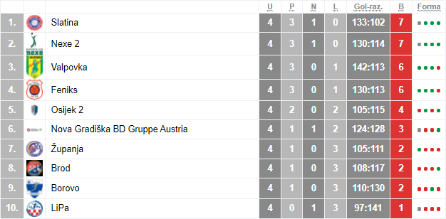 Na ljestvici prvo mjesto dijele Slatina i Nexe, dok je LiPa zauzela posljednje mjesto, no uz minimalan razmak za Borovom, Brodom i Županjom: