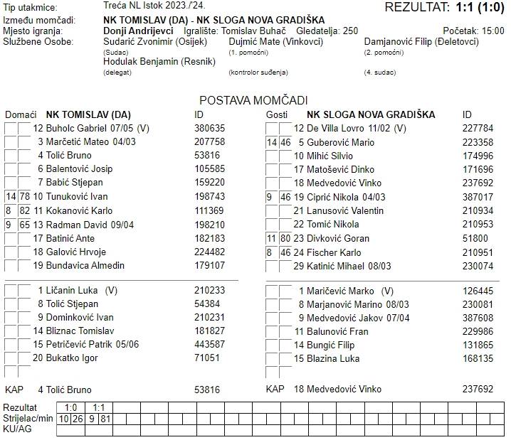 – Prvo poluvrijeme bilo je jedno od najboljih ove sezone. Vodili smo 1:0, imali još šansi i kontrolu nad utakmicom. Drugo poluvrijeme bilo je najgore ove sezone, gdje nas je Sloga samljela. Na kraju možemo biti sretni s osvojenim bodom. Čestitam mojoj ekipi na tom bodu. Gostima želim sreću u nastavku prvenstva – riječi su Bernarda Brnjića, trenera Tomislava.