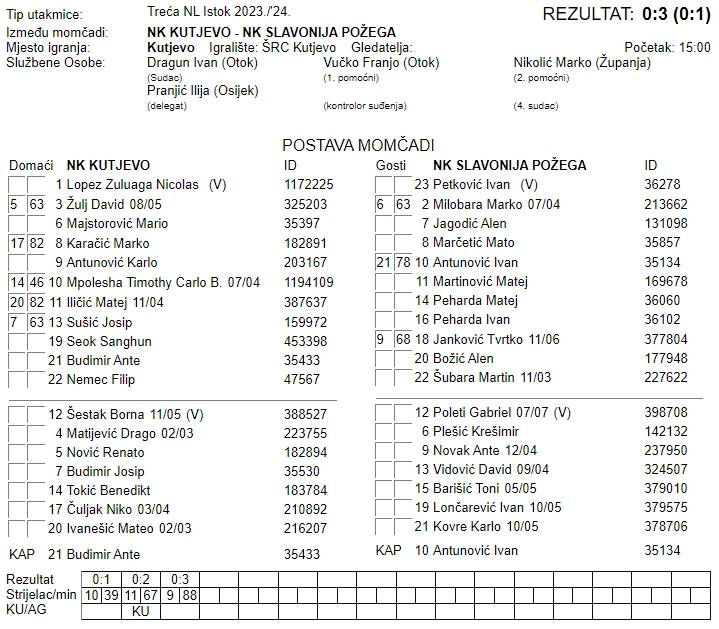 Na kraju uvjerljivo slavlje Slavonije u Kutjevu, no konačni rezultat skriva da niti igra Slavonije nije bila na nekakvoj visokoj razini. Pobjeda Plavih apsolutno je zaslužena, no Poleti teško da može biti zadovoljan onim što su njegovi igrači pokazali. A o igri Kutjeva teško je i napisati nekakav komentar osim da je to bilo negledljivo, za 90 minuta su uspjeli jednom opaliti unutar okvira Petkovićevog gola, a i taj jedan nije iziskivao da se iskusni vratar Slavonije pomakne s mjesta na kojem je stajao prilikom izvođenja slobodnog udarca. Na drugoj strani Zuluaga je imao jednu obranu. A počelo je dobro, uvodnih 10-15 minuta barem smo gledali žestoke duele, ulazilo se u kost na obje strane, slutilo je na zanimljivu utakmicu, no onda se sve jednostavno ugasilo. Jedino što uopće vrijedi izdvojiti je prekrasna akcija Slavonije za 1:0, probili su desnu stranu domaće obrane, Martinović povratnom nalazi Ivana Antunovića a on sa 4-5 metara lakoćom posprema u mrežu. Na poluvremenu Čuljak ubacuje Tokića čijih uvodnih 10ak minuta vrijedi izdvojiti kao jedino pozitivno kod Kutjeva, a ako izdvajamo jednog igrača i to na period od 10 minuta, sve je jasno. Kad se i on uklopio u izdanje ostatka momčadi Slavonija je samo čekala svoju priliku, jednu su propustili, odnosno Zuluaga je obranio pokušaj iz gužve, a onda Ivan Antunović prima loptu u kaznenom prostoru, domaći ga ruše i Matej Martinović s bijele točke prekida svoj golgeterski post. Dvojbu igrač utakmice Martinović ili Antunović Matej je otklonio asistencijom za treći pogodak, iako je i sam vjerojatno mogao poentirati, ispoštovao je mlađeg suigrača i lijepo mu servirao za njegov prvijenac u sezoni. To su oni potezi koji se kasnije vrate… S obzirom na položaj na ljestvici i na dosadašnji bodovni učinak bilo je iluzorno očekivati nekakav veliki nogomet, ali ovo je ipak bilo ispod razine ove lige, a u Požegi neće puno mariti za to, Slavonija se barem rezultatski probudila i stvari za njih izgledaju puno pristojnije u odnosu na samo tjedan dana ranije, dvije vezane pobjede došle su Poletiju kao melem na ranu.
