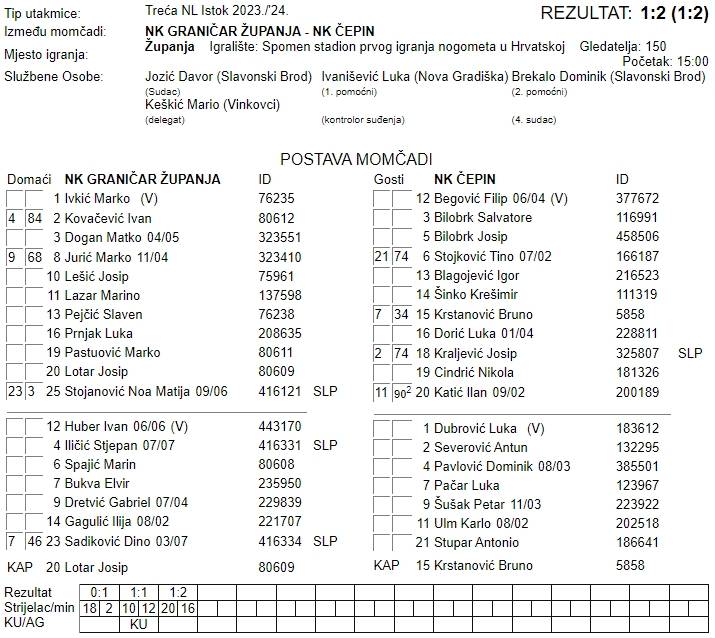 Važna pobjeda za Čepin koji se iz Županje vratio s vrijednim bodovima kojima si je otvorio priliku da se potpuno uključi u borbu za jesensku titulu, ako se iz Kutjeva vrate s tri boda, a od tamo se svi vraćaju s bodovima, eto ih na samo bod iza ove kilometarske kolone klubova koji su skupili po 16 bodova. Što se golova tiče sve važno dogodilo se u samom otvaranju utakmice, već u drugoj minuti Čepin je došao do prednosti, strijelac je Josip Kraljević. Njegov imenjak Lešić u 12. minuti zabija trećii gol Graničara u sezoni, sigurno je realizirao kazneni udarac i vratio Graničar u egal, no oni su u egalu kad se sve zbroji bili šest minuta, u 16. novu prednost gostima donosi Ilan Katić, a kako su mreže do kraja mirovale bio je to i pobjednički zgoditak. Mreže su mirovale ali ne i igra, čak 13 žutih kartona govori da uzbuđenja nije nedostajalo, a pravo je čudo da nitko nije skupio dva. Za Graničar se nastavlja hod po mukama, jedina utjeha za aktualne viceprvake je to što u ligi postoje podjednako loši, Kutjevo, Slavija i Tomislav ne odmiču, i Vuteks je tu blizu pa je dojam da se s jednom pobjedom puno toga može pomaknuti na bolje.