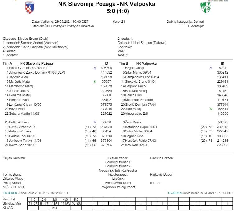 Dugo nismo vidjeli razigraniju Slavoniju, a bilo je izvrsnih partija požeške momčadi u posljednje dvije godine. Šansa za šansom se redala pred gostujućim golom. Ovih 5:0 nije realan odraz kvalitete ove dvije momčadi, ali što se ovih 90 minuta tiče, moglo je to i gore završiti po Zelene da su domaći napadači bili malo precizniji i mirniji. U najpozitivnijem mogućem smislu, Valpovci se obilo o glavu što želi igrati nogomet, nisu stali u dvostruki blok, Slavonija je sjajno koristila otvorene koridore i na kraju u drugom poluvremenu došla do uvjerljive pobjede uz četiri gola u samo devet minuta, bio je to raspad sistema kod gostiju. U prvom poluvremenu jedini strijelac bio je Matej Martinović koji je pospremio jedan odbijanac nakon izvrsne obrane Ezgete. U nastavku dok se još “pola” gledatelja nije vratilo Slavonija je već osigurala pobjedu, Mato Marčetić je pogodio za 2:0, pa Matej Martinović s bijele točke za 3:0. Nakon serije promašaja, put do mreže pronašao je i drugi Matej, Peharda, on je pogodio za 4:0. Točku na i stavio je Ivan Antunović u 56. minuti. Tu su Plavi ipak spustili gas, odradili posao do kraja i dali minutažu seriji mladih igrača iz klupske škole, i oni su imali prigoda, držali su posjed i pokazali da redom mogu igrati ozbiljne uloge u seniorskom nogometu.