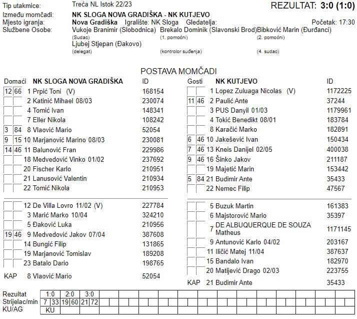 Prekinula je Sloga seriju loših rezultata i došla do tri boda koja znače ostanak u ligi. Kutjevo je s druge strane prekinulo lijepu seriju bez poraza, no njemu je svakako puno važniji dvoboj koji se u srijedu igra u Pleternici u polufinalu Kupa. Sloga je svoju bolju igru okrunila golom s bijele točke kojeg je postigao Nikola Eller, a u drugom poluvremenu pobjedu su potvrdili Tomislav Marjanović koji očigledno jako voli igrati protiv Kutjeva, te junak utakmice Valentin Lanusović.