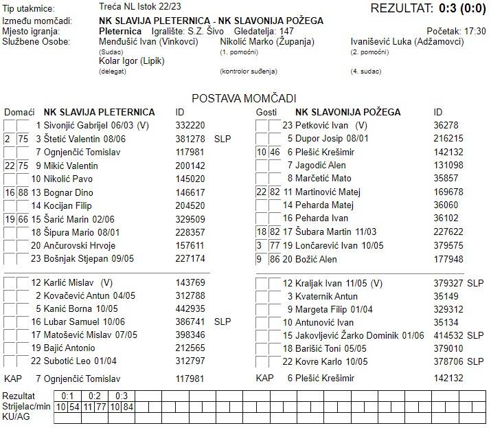 Vrlo dobra nogometna predstava u Pleternici iz koje su kao pobjednici izašli gosti iz Požege koji su se kako smo rekli vratili na vrh ljestvice i tako prebacili lopticu u ruke Graničaru. Od početka je Slavonija bila bolja, domaćin je tek povremeno pokušavao izlaziti sa svoje polovine, no stvorene prilike ostale su neiskorištene u prvom poluvremenu, pa čak i ona najbolja kada najbolji strijelac lige ima priliku s jedanaest metara. U nastavku ipak Slavonija lomi otpor domaćina, poslao je Poleti u igru i Ivana Antunovića a ovaj već u 54. minuti pogađa za 1:0. Imala je Slavija nedugo potom svoju najbolju šansu za poravnanje, a kada je nisu iskoristili stigla je kazna, u 77. za 0:2 pogađa Matej Martinović, u 84. za konačnih 0:3 još jednom Antunović stariji.