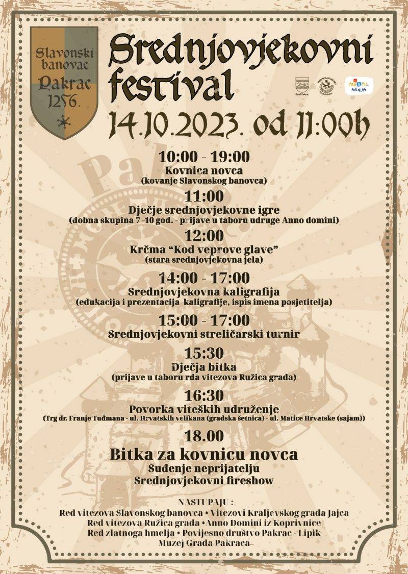 Bogat program i raznovrsni sadržaji posjetitelje očekuju i na Srednjovjekovnom festivalu na kojem će uz domaće vitezove Slavonskog banovca, te Povijesno društvo Pakrac – Lipik i Muzej Grada Pakraca sudjelovati članovi Reda vitezova Ružica grada iz Orahovice, Anno domini iz Koprivnice, pripadnici Reda zlatnog hmelja, te gosti iz susjedne BiH, Udruga Vitezovi kraljevskog grada Jajca.