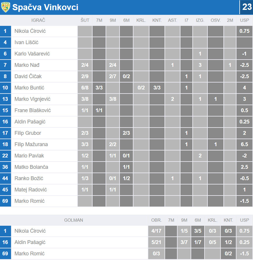 Najefikasniji kod Spačve Marko Buntić sa šest pogodaka. Ravnić je dodao pet, koliko je zabio i Obradović. PPD Zagreb je tako prvi osigurao polufinale Kupa Hrvatske. Preostali parovi 19. svibnja: