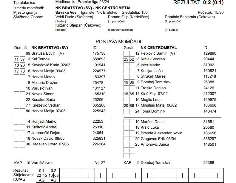 Centrometal je u odličnom nizu, nova pobjeda donijela mu je treće slavlje zaredom. Međuti, golove za Centrometal nisu postigli igrači trenera Nikole Goričanca, već domaćini. Prvo je u 45. minuti autogol dao Saša Kosalec, da bi isto učinio u 63. Ivan Vurušić.