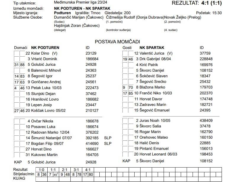 Još jedna loša utakmica Spartaka i dobra Podturna. Domaćini su na krilima dvostrukog strijelca Igora Šegovića (36′, 78′) porazili gosta iz Male Subotice. Preostala dva gola dali su Andrej Goričanec u 48. i Filip Bogdan u 80. minutama utakmice. Jedini gol za gosta dao je Srećko Šegović u 45’+1 prvog poluvremena.