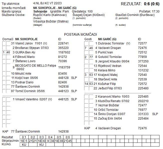 Posljednjeplasirano Suhopolje sa šest bodova na kontu već prije ovog kola znalo je da će sezonu završiti kao posljednja momčad lige, a u goste im je stigao Garić iz Garešnice koji je pronašao formu u posljednja dva susreta te uz dva slavlja obilježio i impresivnu gol razliku 13:1!