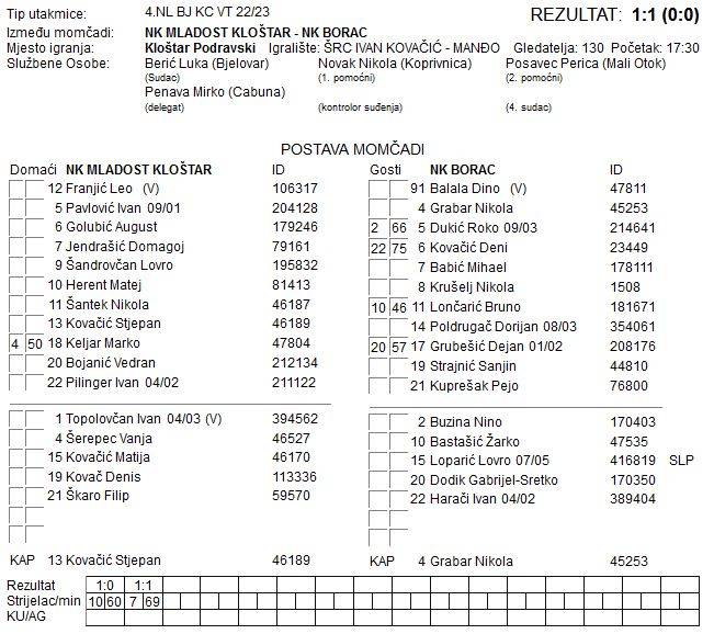 Oba pogotka na susretu 130 okupljenih gledatelja moglo je vidjeti u drugom poluvremenu. U 60. minuti Mladost je u vodstvo doveo prekrasnim pogotkom Matej Herent, a odgovor gostiju iz Imbriovca stigao je devet minuta kasnije kada je uspostavit će se konačnih 1:1 i podjelu bodova u Kloštru Podravskom postavio je Mihael Babić.