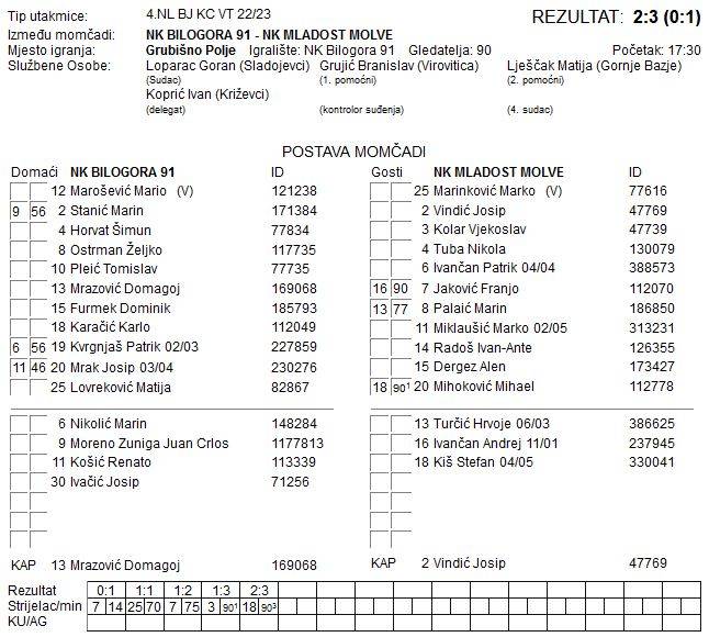 Franjo Jaković u 14. minuti doveo je Mladost iz Molvi u početno vodstvo, a na idući pogodak čekalo se sve do 70. minuti kada Matija Lovreković izjednačuje susret za domaćina. Pet minuta kasnije gosti iz Molvi ponovno vode drugim pogotkom na susretu Franje Jakovića. Potvrda slavlja Mladosti stigla je u 91. minuti pogotkom Vjekoslava Kolara, a na konačnih 2:3 uspio je za Bilogoru smanjiti Karlo Karačić.