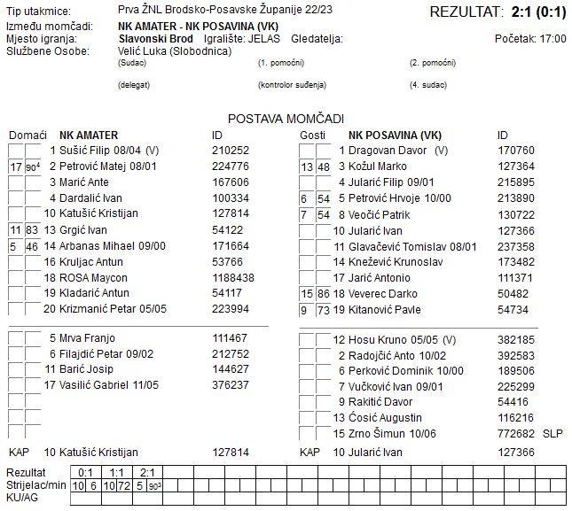 Počelo je odlično za goste na Jelasu kada je u šestoj minuti susreta Ivan Jularić doveo Posavinu u vodstvo. U 17. minuti nakon igranja rukom posljednjeg igrača obrane Filipa Jularića gosti su ostali s igračem manje, no ipak su uspjeli držati minimalnu rezultatsku prednost, sve do sedamdeset i druge minute kada Kristijan Katušić izjednačuje susret za Amater. I kada se već činilo da će svaka momčad uprihoditi po bod, Franjo Mrva u devedeset i trećoj minuti susreta donosi tri boda Amateru i konačan rezultat susreta 2:1!