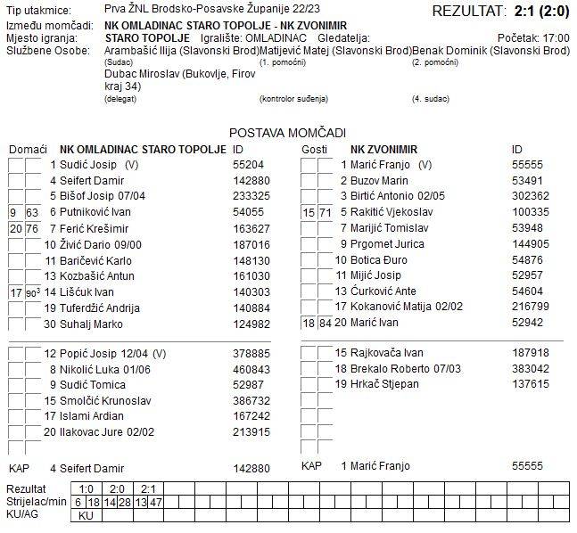 U osamnaestoj minuti susreta Ivan Putniković doveo je Omladinac u vodstvo, a već deset minuta kasnije tu prednost je udvostručio Ivan Lišćuk. Unatoč činjenici da su od dvadeset i treće minute igrali s igračem manje, gosti ne odustaju te u drugoj minuti drugog poluvremena smanjuju rezultat na 2:1 preko Ante Ćurkovića. Iako je utakmica do samog kraja bila neizvjesna, sva tri boda ipak ostaju u Starom Topolju.