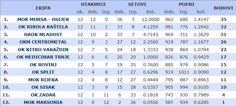 U lokalnom derbiju odigranom u Varaždinu domaći je Kitro Varaždin izgubio od Centrometala s 1:3 (18:25, 25:22, 17:25, 11:25), u susretu koji je potrajao 99 minuta. Trećeplasirana Mladost se, kao gost, lako obračunala na gostovanju u Novom Zagrebu protiv šesto plasirane momčadi Medicinar Trnja, pobijedivši 3:0 (12, 15, 16) za 65 minuta igre. Zadar je pak kod kuće izgubio od Ribola Kaštela s 0:3 (20, 18, 18) za 75 minuta igre, pa su im se tako gosti revanširali za poraz u Kupu Hrvatske kojim su pretposljednji Zadrani neočekivano dobili drugoplasiranu momčad Superlige. Mursa Osijek, vodeća momčad Superlige, s 3:0 (20, 15, 20) pobijedila je za 71 minutu kod kuće Rijeku, koja se trenutno nalazi na 9. mjestu. Posljednje plasirana Marsonia, još bez pobjede, je na gostovanju u Rovinju izborila 1 bod, domaćin je na kraju pobijedio s 3:2 (20:25, 26:24, 22:25, 25:20, 16:14), nakon iscrpljujuće 131 minute igre. Deseti Sisak je s 3:1 (25:23, 25:22, 24:26, 25:22) pobijedio osmi Split u susretu koji je trajao 106 minuta.