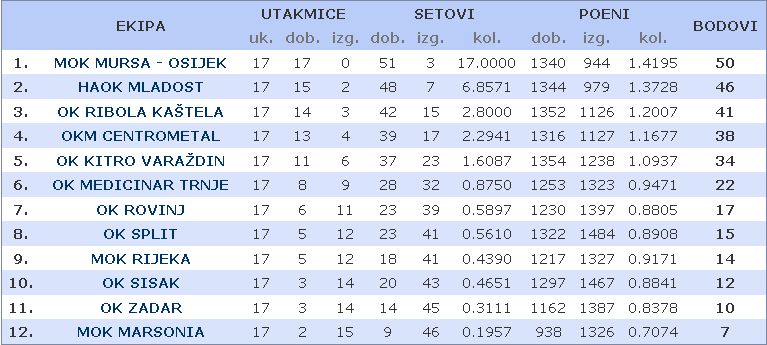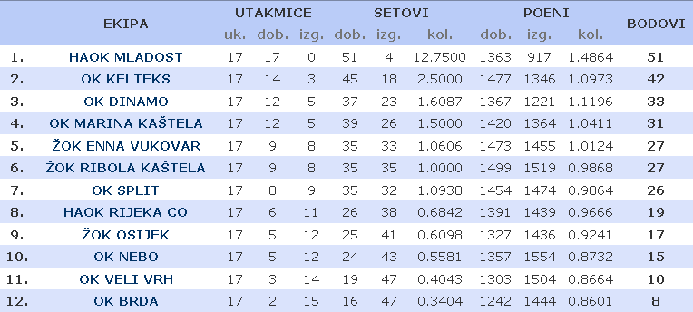 Odbojkaši Mladosti zadržali su drugu poziciju nakon derbija 17. kola, gdje su u Kaštelima za 87 minuta igre pobijedili domaću momčad Ribole s 3:0 (18, 23, 22) uzvrativši im tako za poraz u prvom dijelu Superlige u Dom odbojke kada je bilo 3:1 za goste. Vodeća Mursa Osijek nakon 67 minuta igre pobijedila je Medicinar Trnje s 3:0 (14, 20, 18), a četvrto plasirani Centrometal u Rijeci je savladao domaću momčad s 3:0 (23, 27, 11), za što su im trebale 83 minute. Posljednje plasirana Marsonia je zabilježila i drugu pobjedu u Superligi, s 3:1 (23:25, 25:16, 25:22, 25:20) pobijedili su Split nakon 97 minuta. Zadrani su ipak malo pokvarili veselje Marsonie jer su i oni, kao predzadnji na tablici, također slavili, doduše puno teže, u pet setova, protiv Siska, bilo je 3:2 (19:25, 25:20, 25:21, 24:26, 15:11) poslije 124 minute igre. Ranije u tjednu Kitro Varaždin je s 3:0 (12, 15, 15) za 70 minuta pobijedio Rovinj u gostima.