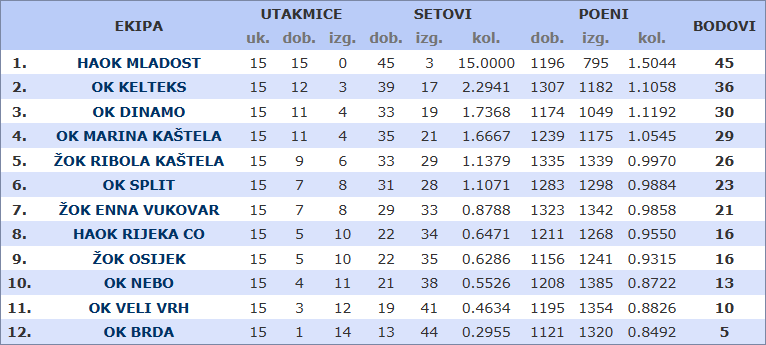 Mladostašice su bez veće muke pobijedile Ennu Vukovar s 3:0 (17, 13, 22) za 70 minuta igre i zadržale prvu poziciju bez poraza nakon 15 odigranih kola. Dinamo je također s 3:0 (9, 21, 17) za 68 minuta riješio pitanje pobjednica u srazu s Marinom Kaštela. Osijek je kod kuće u pet setova nadigrao Split, bilo je 3:2 (18:25, 25:13, 25:19, 24:26, 15:13) nakon 124 minuta igre. Imale su domaće set meč loptu nakon vodstva 2-1 u setovima, bilo je 24:23, ali gošće osvajaju tri poena u nizu i susret odvode u neizvjesnost petog seta. U kojem su domaće vodile većim dijelom, imale i 14:10, da bi na kraju pobijedile s tijesnih 15:13. Drugoplasirani Kelteks slavio je u Rijeci, bilo je 3:1 (25:22, 14:25, 25:19, 25:22), poslije 93 minute igre. Nebo je slavilo u Puli protiv Velog Vrha, bilo je 2:3 (25:27, 22:25, 25:22, 25:11, 15:17), poslije 127 minuta igre.