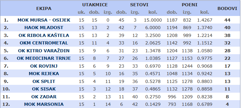 Ovog vikenda dovršeno je i 15. kolo odbojkaške Superlige. U vrlo važnom susret odbojkašice Osijeka svladale su Split na domaćem terenu, Mursa je nastavila s pobjedama, a prvi trobod osjetili su i odbojkaši Marsonije.